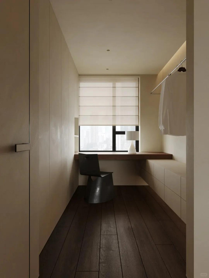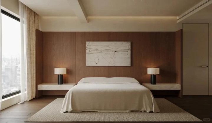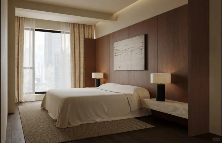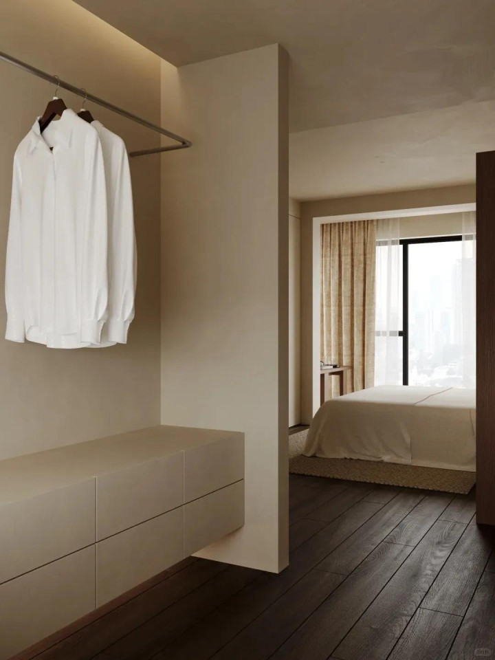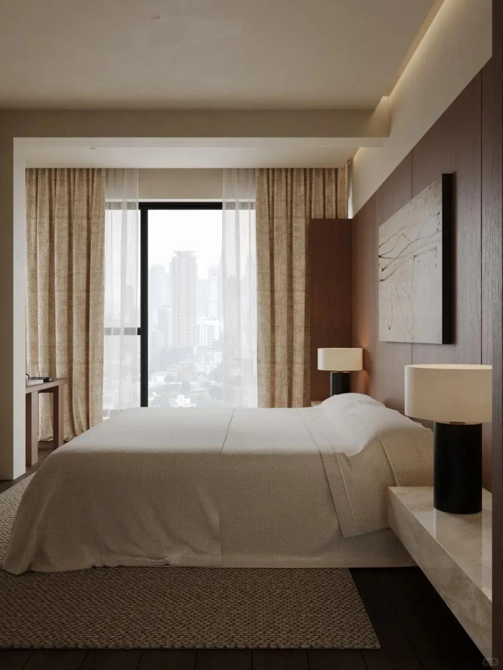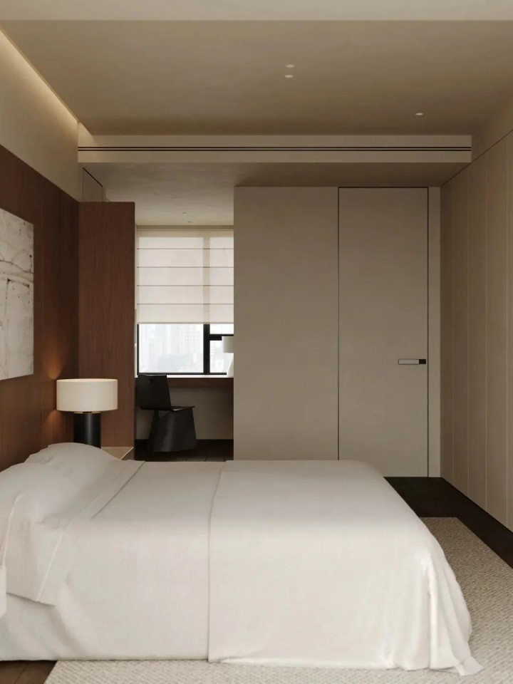卧室色调更暖,融合暖色灯光,营造出一种儒雅而惬意的空间感。材质与色调选拔对比的手法,带来更强视觉冲击力。